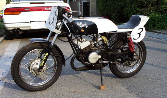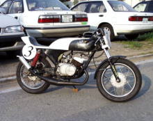 レース仲間の日下部君のマシンです。 仕事の関係で、USAに2年間転勤になるので預かることにしました。 15インチのフロンとタイヤが入手困難なので、14インチのリムを組んでTT100を履いています。 |