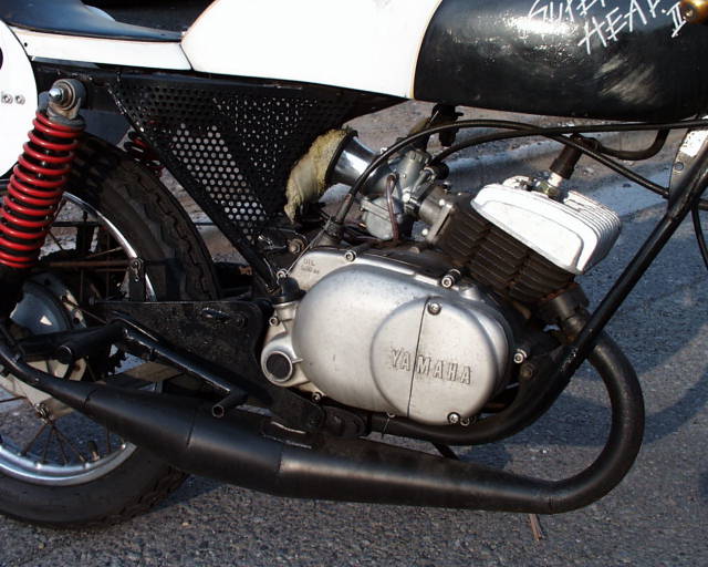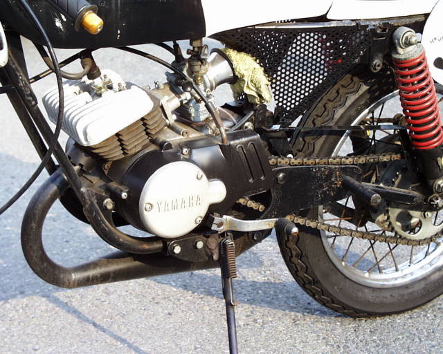 タンクは「オオタニレーシング」製のFRPタンクです。 チャンバーは、キムラレーシング製です。 キャブレターは、ミクニのVM20Φを使用して、ファンネルを付けています。 |