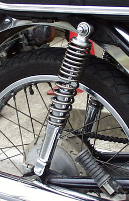 ただし伸び切った場合アクスルシャフトに当たるのでマフラーをフレームに固定している部分にワッシャーを3枚くらい入れた方が良いでしょう。(と言うより入れる必要があります)