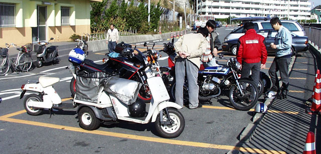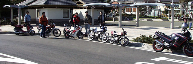 江ノ島に集まった参加車(者)は全部で6台(人)、写真左から、かと〜さん(トレイシー125)、僕goro(RD125)、小田切さん(YSR80)、niyanさん(RD50)、石井さん(GR80)、ぴかぴっちさん(GPX250)です。